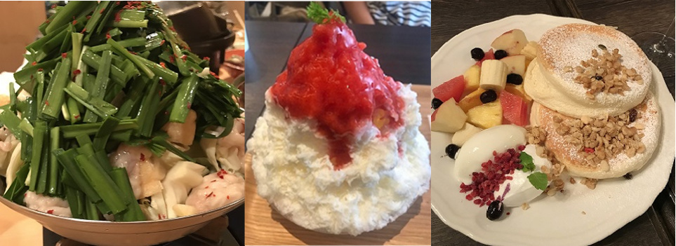 写真左:ニラたっぷりの博多のモツ 写真右: 飲んだ後はパンケーキをシェア!