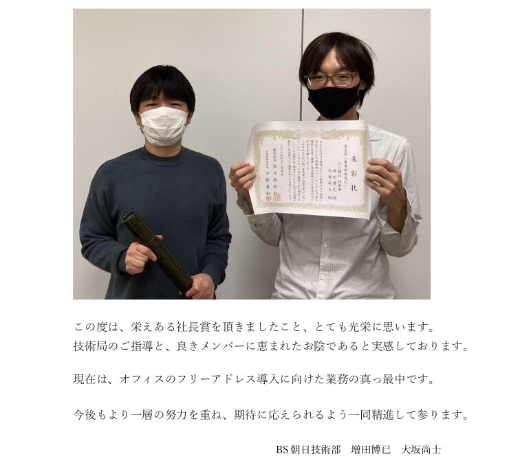 2021年には左旋12chの4K8K放送も開始され、運用が更に複雑になることが予想されます。今回このような賞をいただけたことで、そうした新しい取り組みについても大いに励みとなり、気持ちを新たに精進して参ります。ありがとうございました。