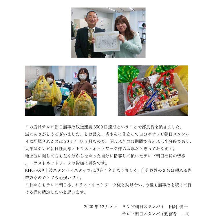東京第1事業部で放送運用、継続について会社より表彰を行っております。
